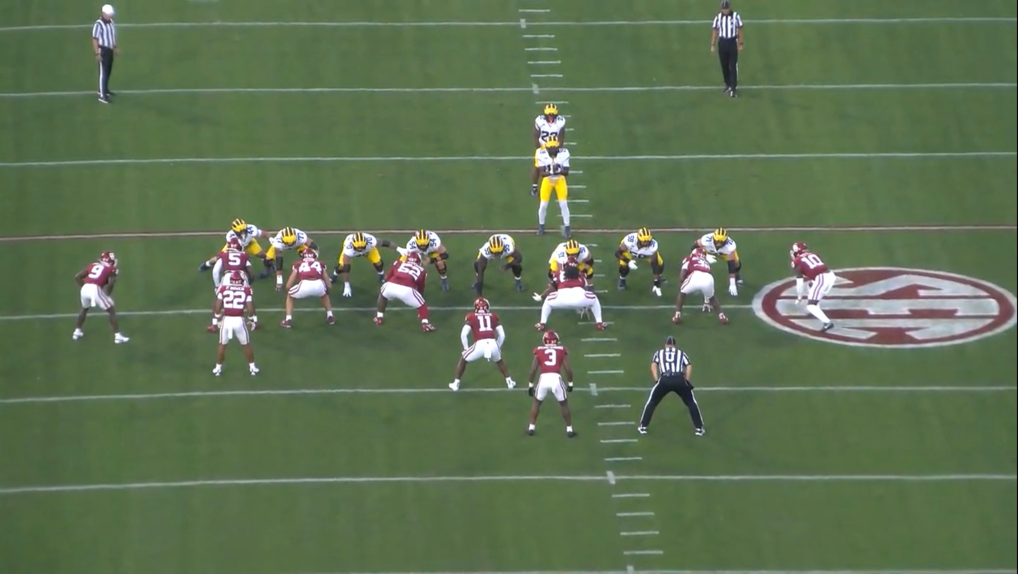 Is that seven offensive linemen plus an in-line tight end on the field for this running play? Why yes, it is. And by the way, this was Michigan’s first offensive play of the game in Norman. That’s one way to send a message about your team’s identity.