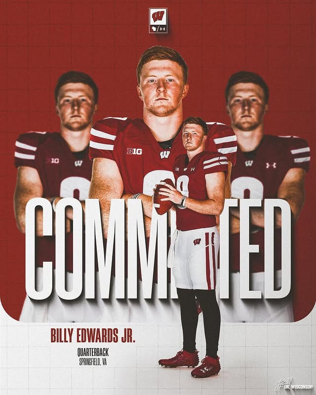 Maryland transfer Billy Edwards Jr. has committed to Wisconsin after taking an official visit, giving coach Fickell and offensive coordinator Jeff Grimes an experienced signal-caller to help lead the Badgers offense in 2025.