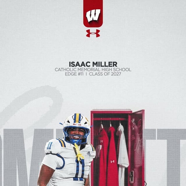 Wisconsin football lands a verbal commitment from 2027 in-state EDGE Isaac Miller, a 6-foot-5 pass rusher from Waukesha Catholic Memorial.